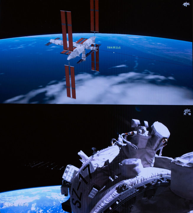 10月26日在北京航天飞行控制中心拍摄的神舟十七号载人飞船和空间站天和核心舱前向端口对接过程的画面。新华社记者 金立旺 摄